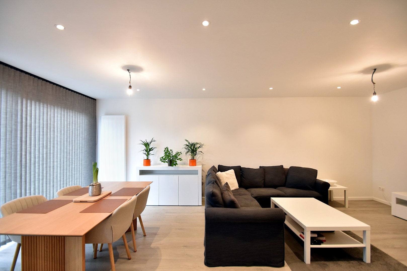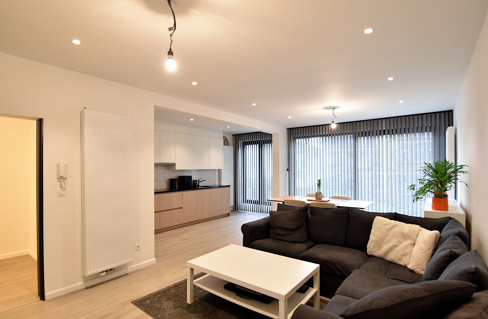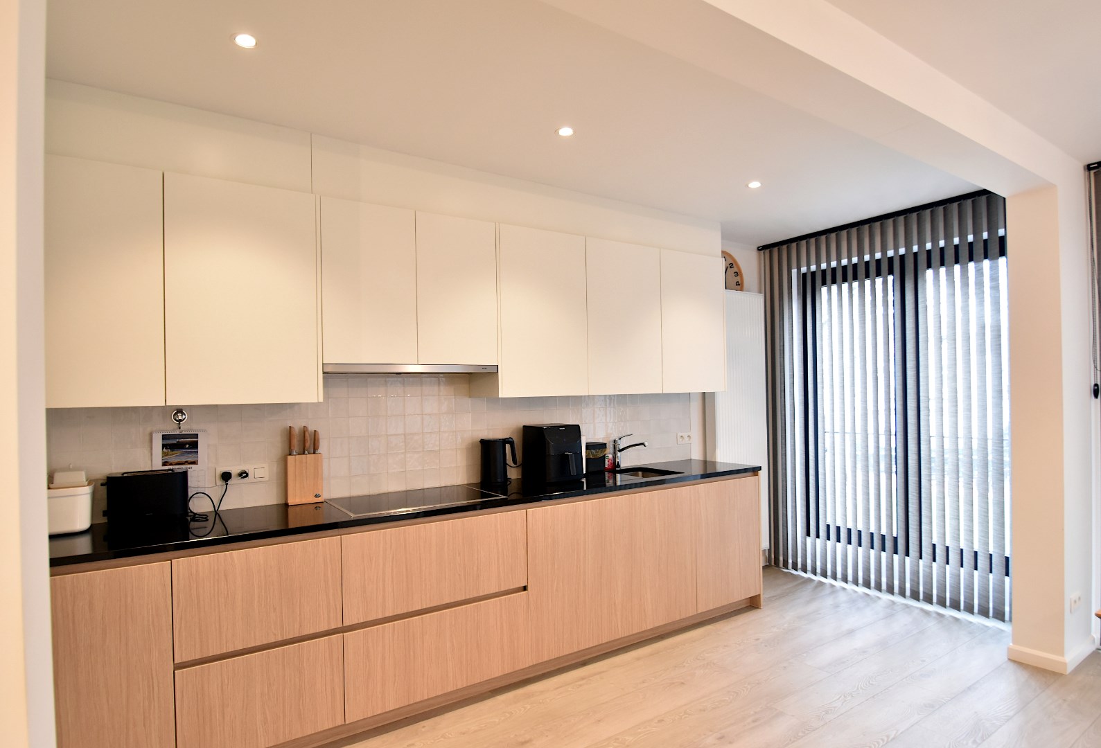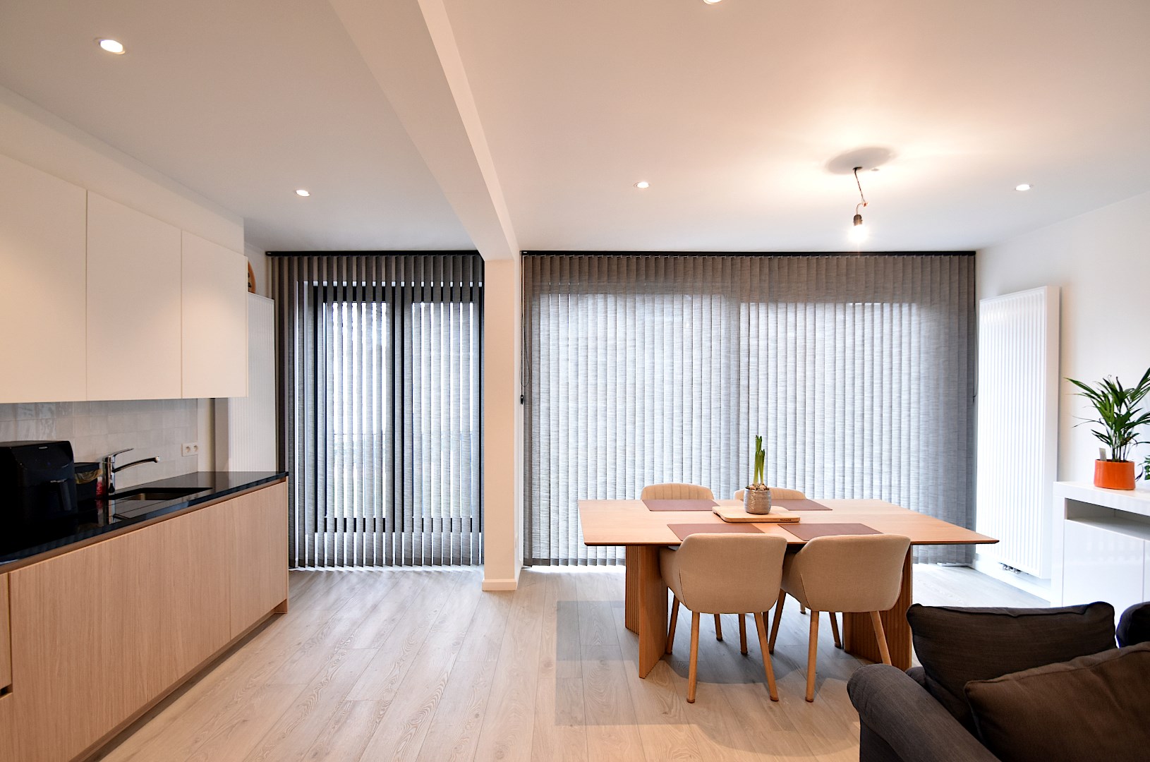 volledig gerenoveerd appartement/rijwoning gelegen in het centrum van De Haan. Het pand wordt niet gemeubileerd aangeboden. De gelijkvloerse verdieping omvat een grote garage met automatische poort en een ruime inkomhall. Op de 1ste verdieping is er een zeer ruime woonkamer met zuidgericht balkon en compleet uitgeruste open keuken, 3 slaapkamers, badkamer met walk -in douche, dubbele wastafel & toilet, berging en een afzonderlijk gastentoilet. In de gang/hall zijn er praktische inbouwkasten voorzien. De derde kamer biedt toegang naar een afgesloten koertje/buitenruimte. Geen algemene/syndic kosten. Geen lift.
