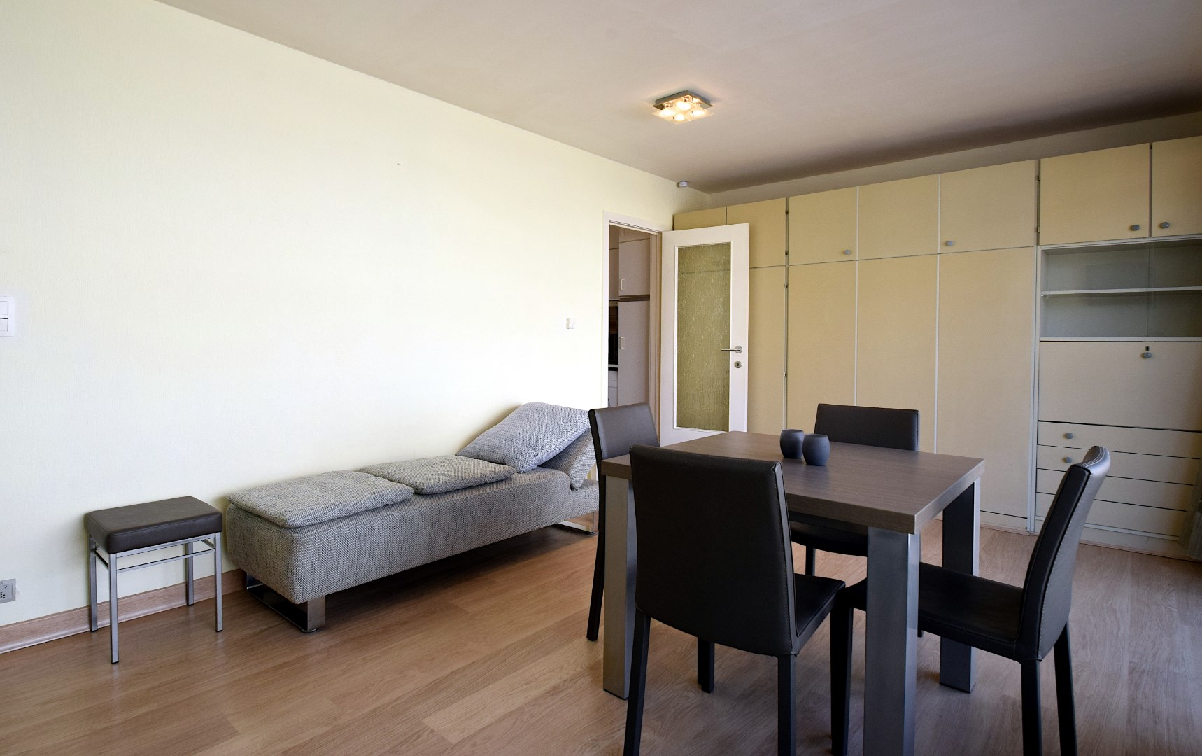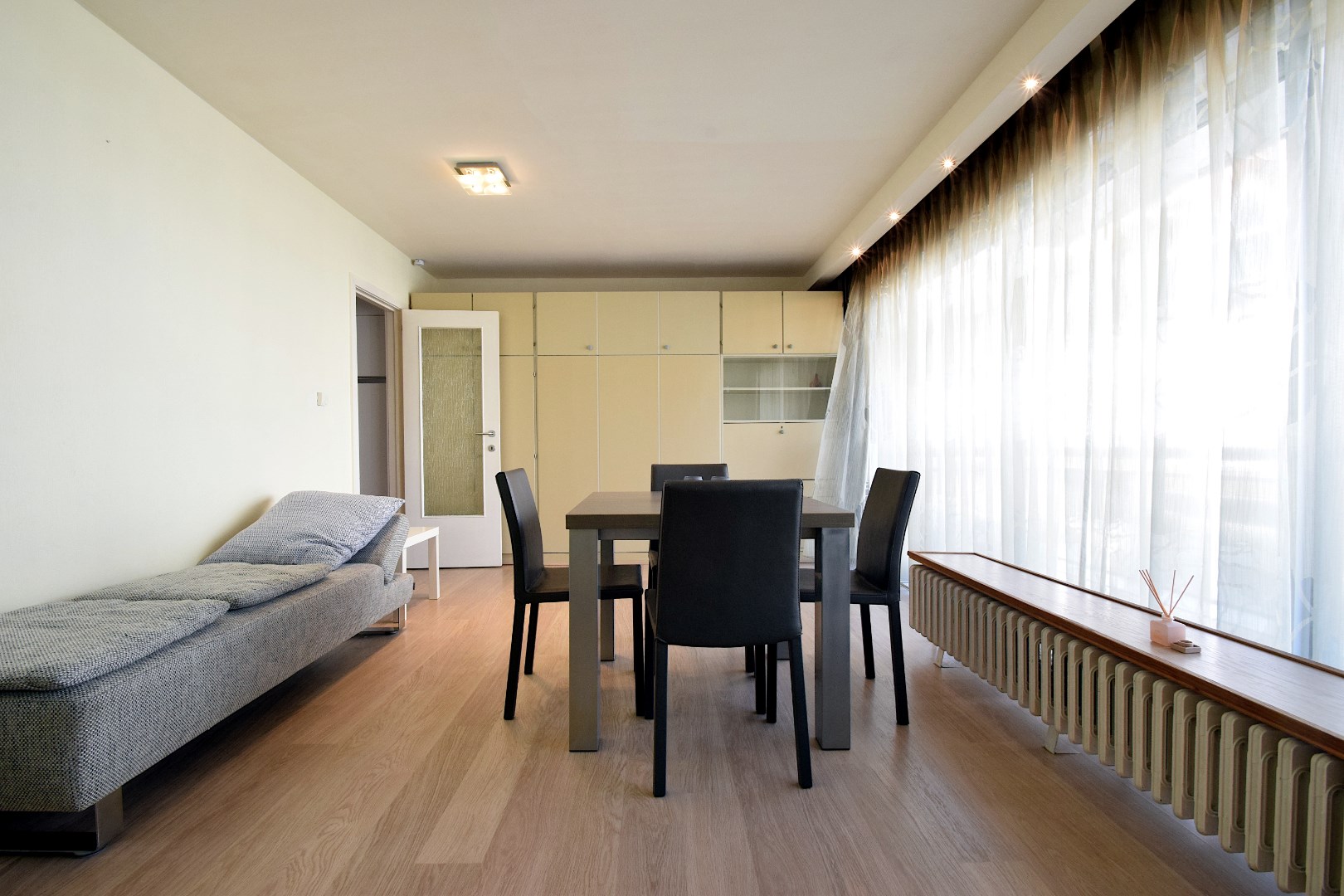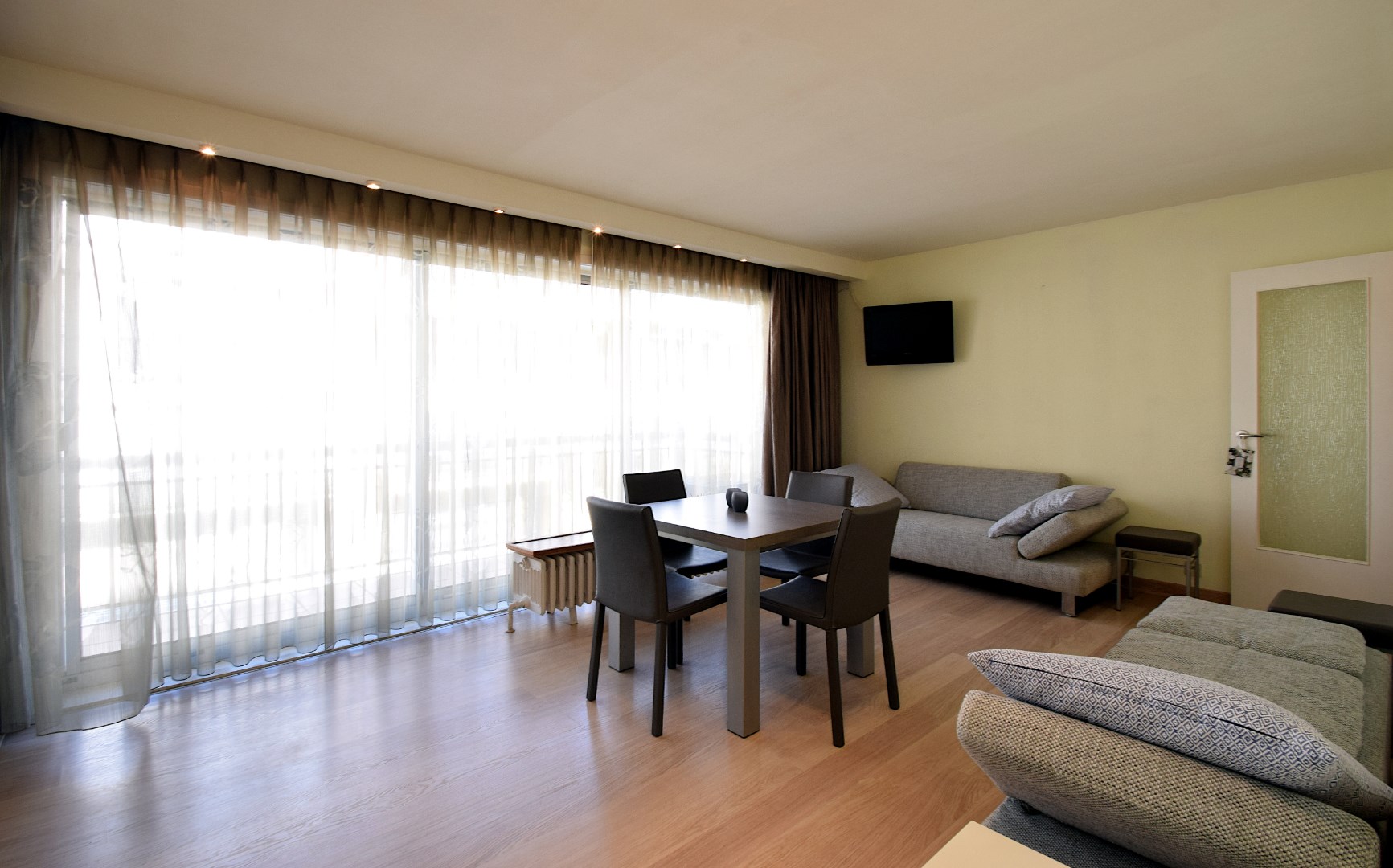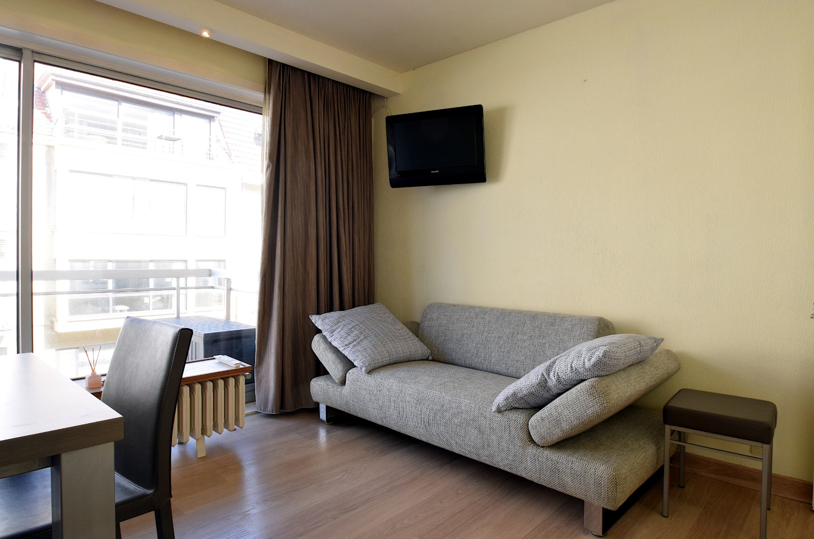 Smaakvol gemeubileerde studio, gelegen op de 1ste verdieping van de residentie Silver Beach. Deze residentie is gelegen op de zeedijk van De Haan, de studio heeft een terras met lateraal zeezicht. Indeling: hall, badkamer met ligbad, wastafel en toilet, woonkamer met kastbed (2 pers.) en terras, ingerichte keuken (incl. wasmachine.). Parkeerplaats met opbergkast in de ondergrondse garage, gebruik van het binnenzwembad. Deze studio wordt enkel verhuurd als 2de verblijf. (Geen hoofdverblijfplaats)