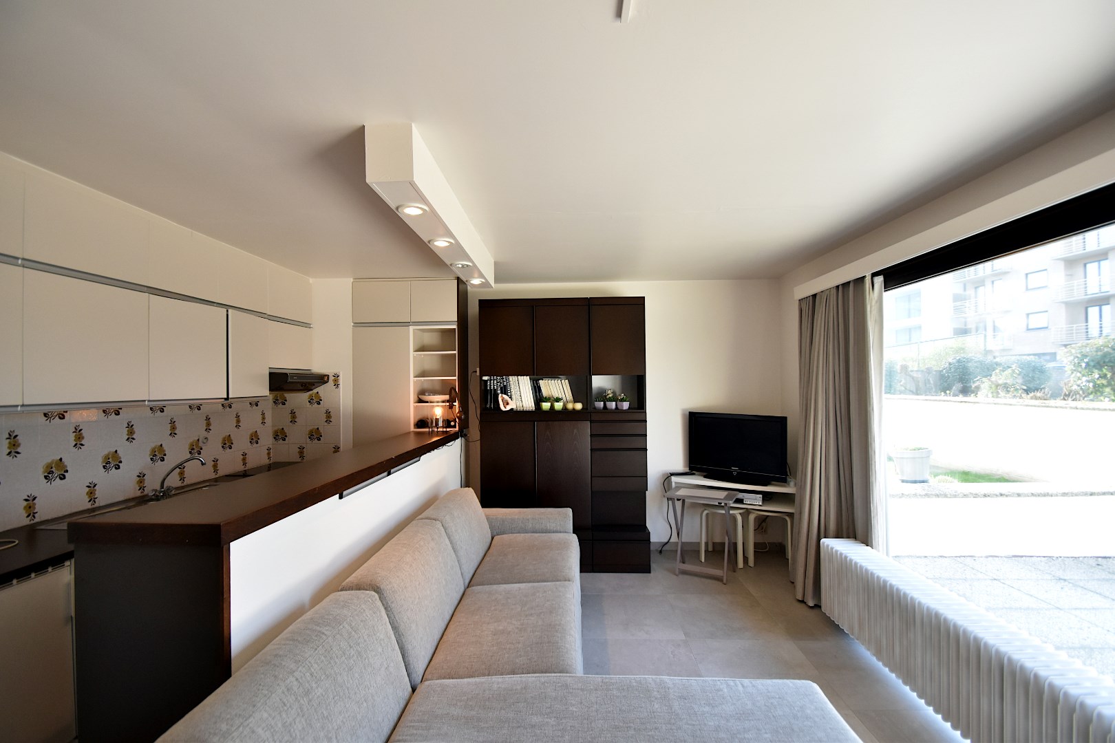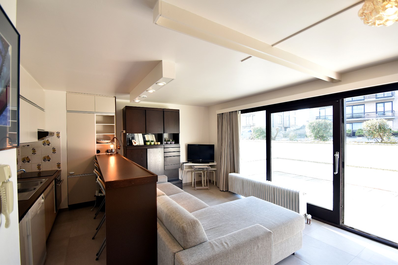 Deze lichtrijke, gelijkvloerse studio geniet van een uitzonderlijke ligging achter aan de Zeedijk en beschikt over een ruim en beschut terras waar u de zeelucht en het buitenleven optimaal kunt beleven. De woonkamer met open keuken baadt in het natuurlijke licht en biedt een veelzijdige ruimte die naar eigen smaak kan worden opgefrist. De inkomhal is voorzien van praktische ingemaakte kasten en leidt naar de badkamer met ligbad, wastafel en toilet. In de studio ligt een recente en moderne tegelvloer. Een privatieve kelder bevindt zich in de ondergrondse.