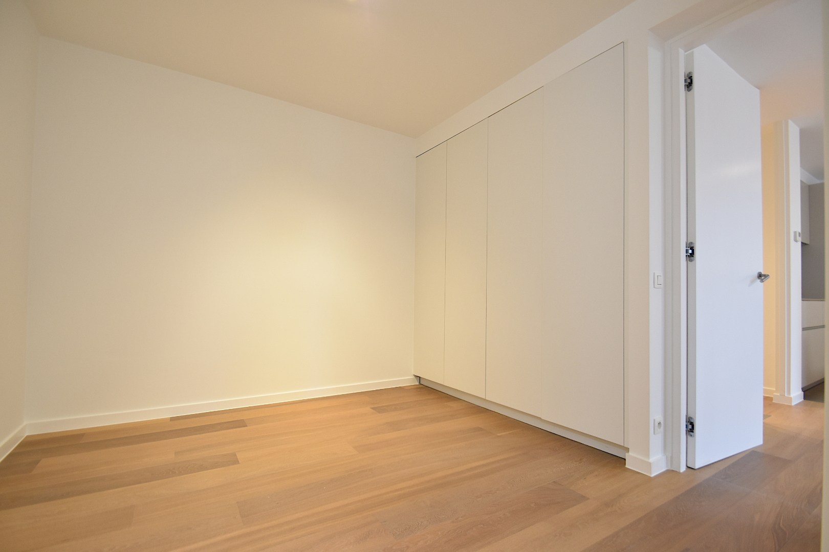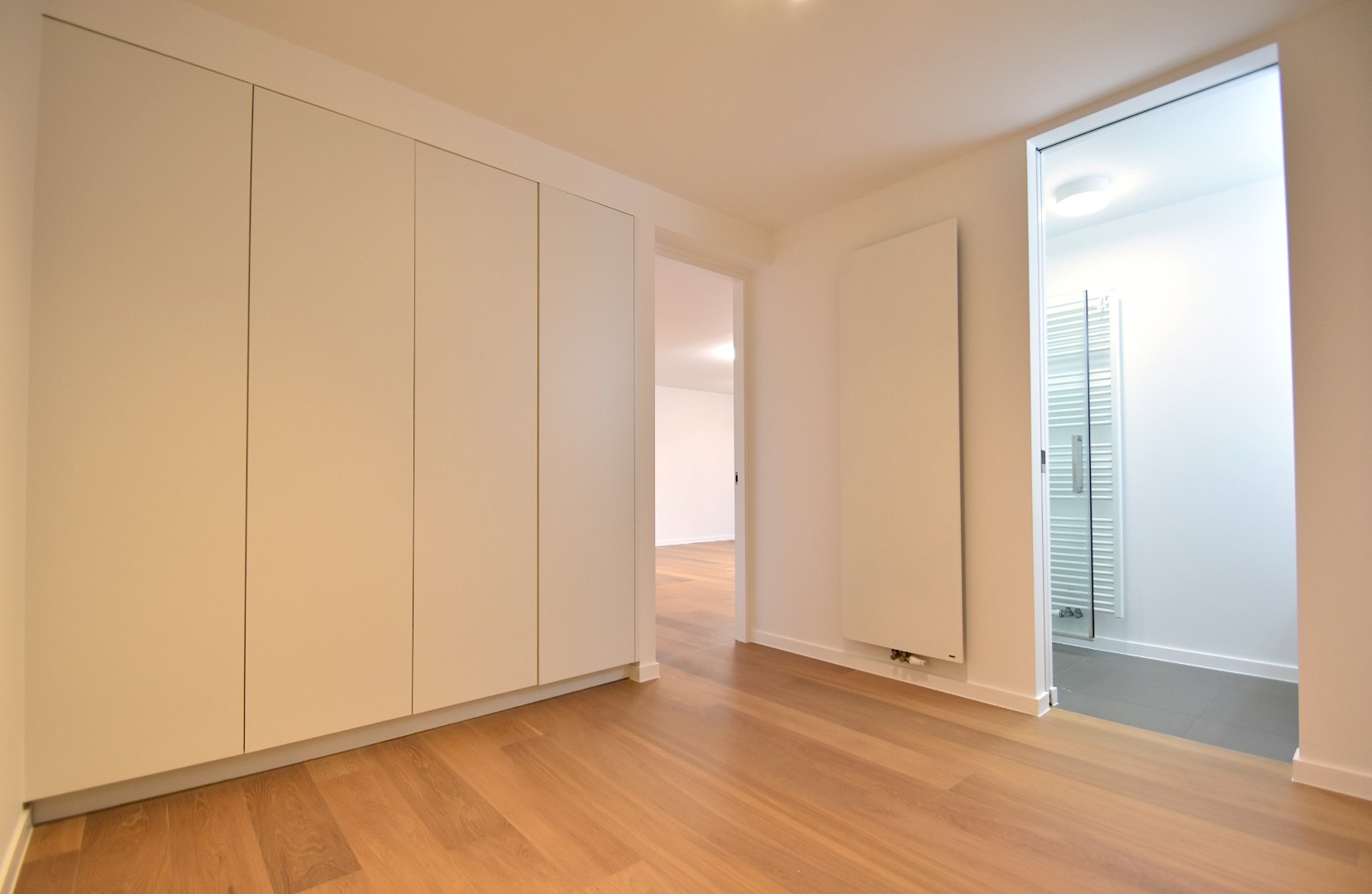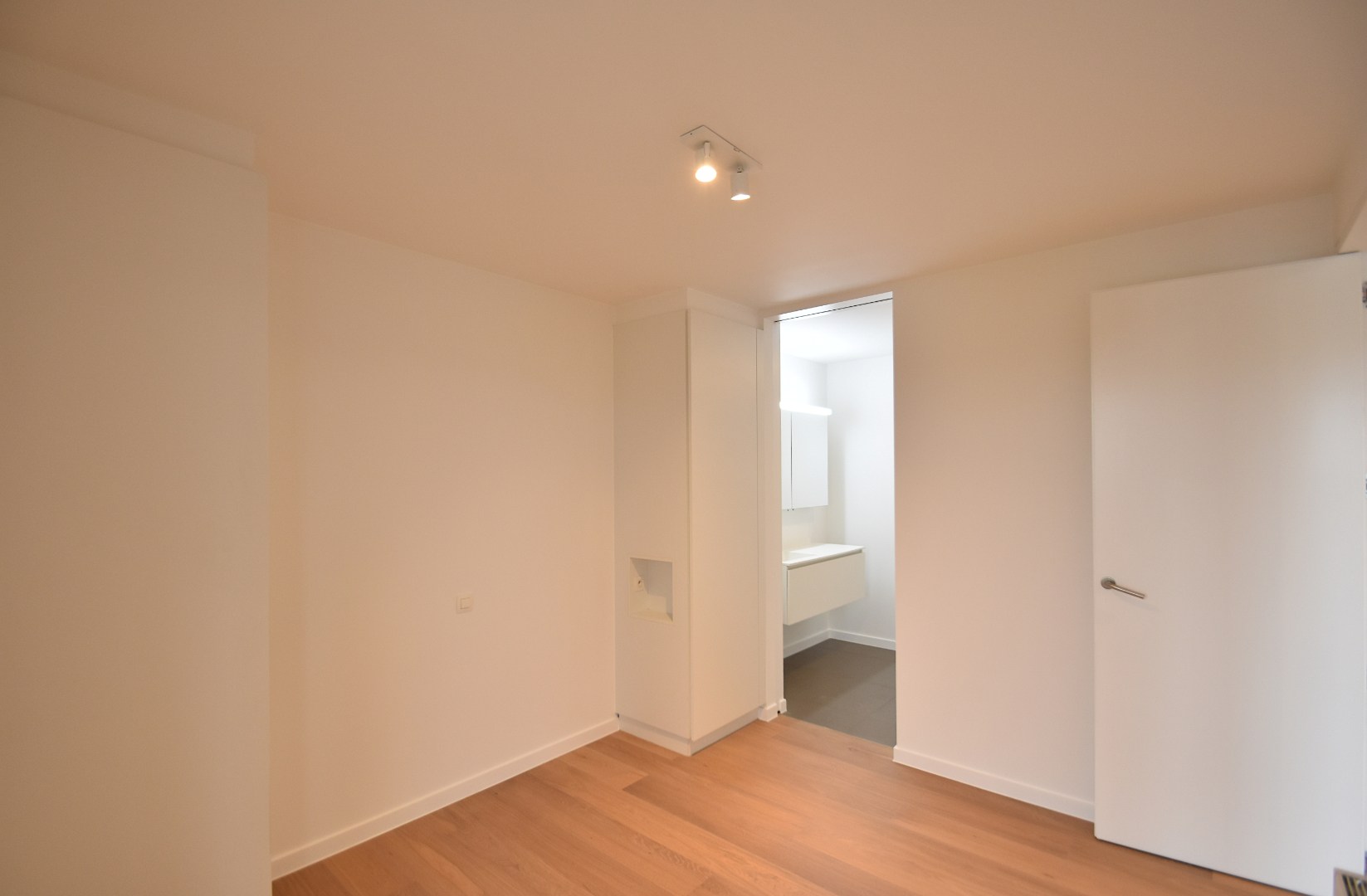 Bij het binnenkomen wordt u verwelkomd in een verzorgde inkomhal met ingemaakte kasten, een gastentoilet en een praktische berging. De ruime leefruimte met salon en open keuken baadt in het licht en geeft uit op een aangenaam zonneterras waar men in alle rust van de middagzon kan genieten. Het appartement beschikt over twee slaapkamers, elk met een eigen ensuite badkamer. 1 slaapkamer is een binnen kamer, zonder raam. De doorlopende hardhouten parketvloer versterkt het gevoel van harmonie en kwaliteit doorheen het volledige appartement.