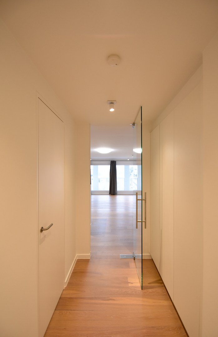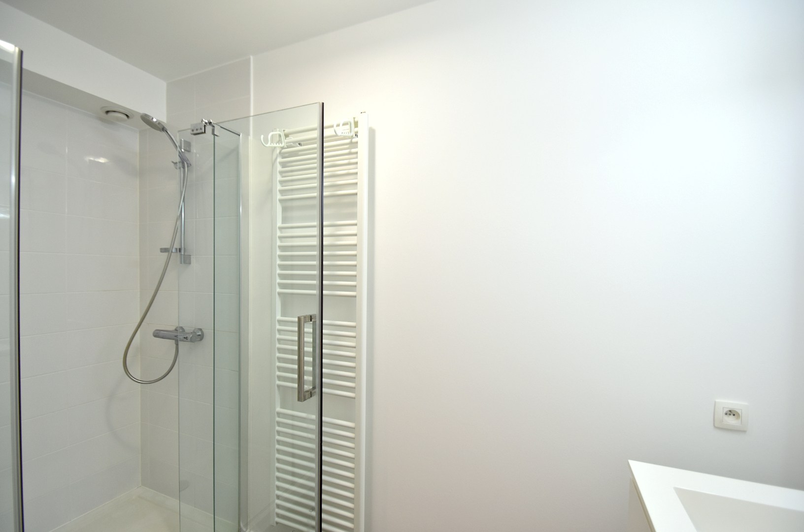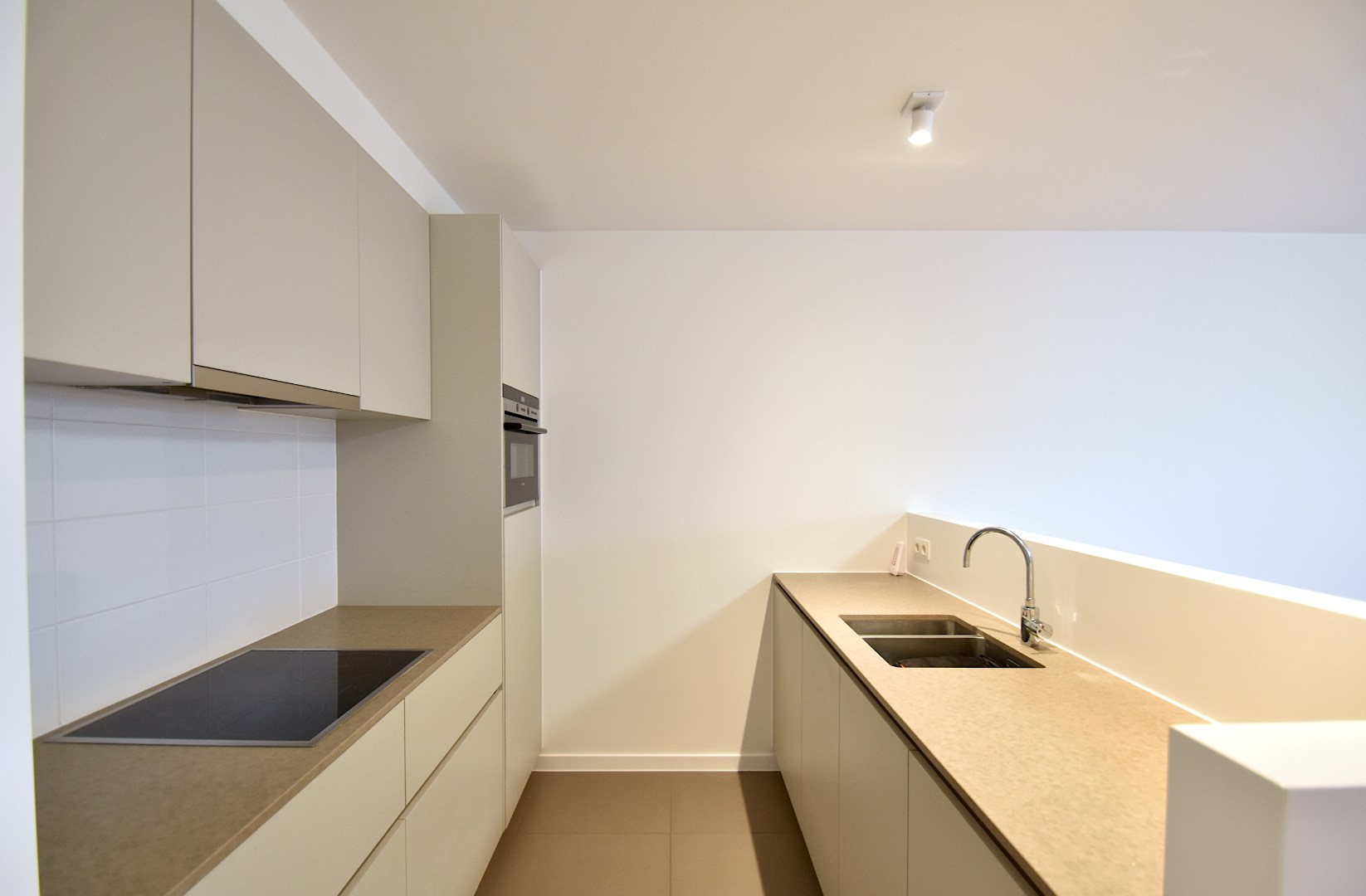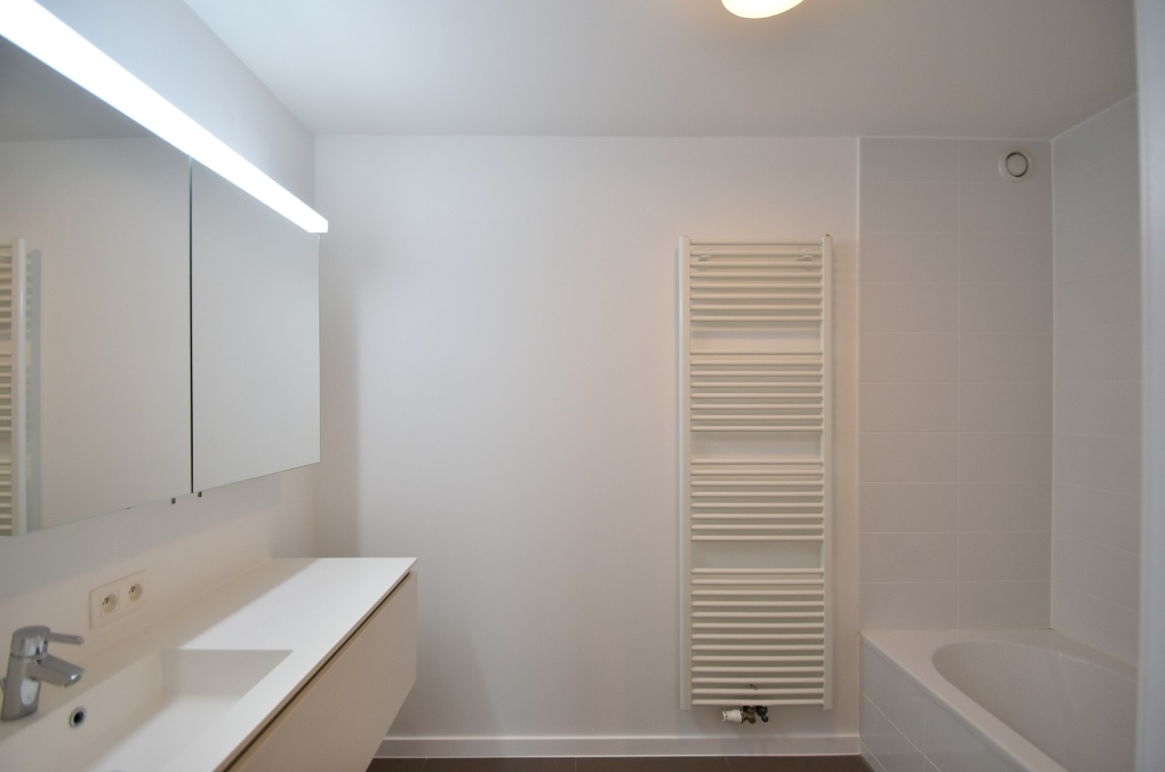 Bij het binnenkomen wordt u verwelkomd in een verzorgde inkomhal met ingemaakte kasten, een gastentoilet en een praktische berging. De ruime leefruimte met salon en open keuken baadt in het licht en geeft uit op een aangenaam zonneterras waar men in alle rust van de middagzon kan genieten. Het appartement beschikt over twee slaapkamers, elk met een eigen ensuite badkamer. 1 slaapkamer is een binnen kamer, zonder raam. De doorlopende hardhouten parketvloer versterkt het gevoel van harmonie en kwaliteit doorheen het volledige appartement.