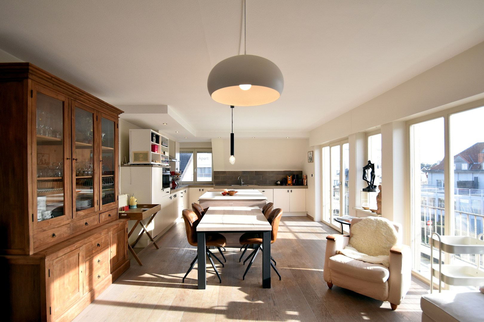 Het appartement geniet van een aangename zuidoriëntatie en een overvloed aan natuurlijk licht. De indeling omvat een nachthal, een ruime zuid gerichte leefruimte met open keuken en een afzonderlijke zithoek. De leefruimte geeft uit op een zonnig terras met open zicht richting de Concessie, waar de zon de hele dag mooi binnenvalt.