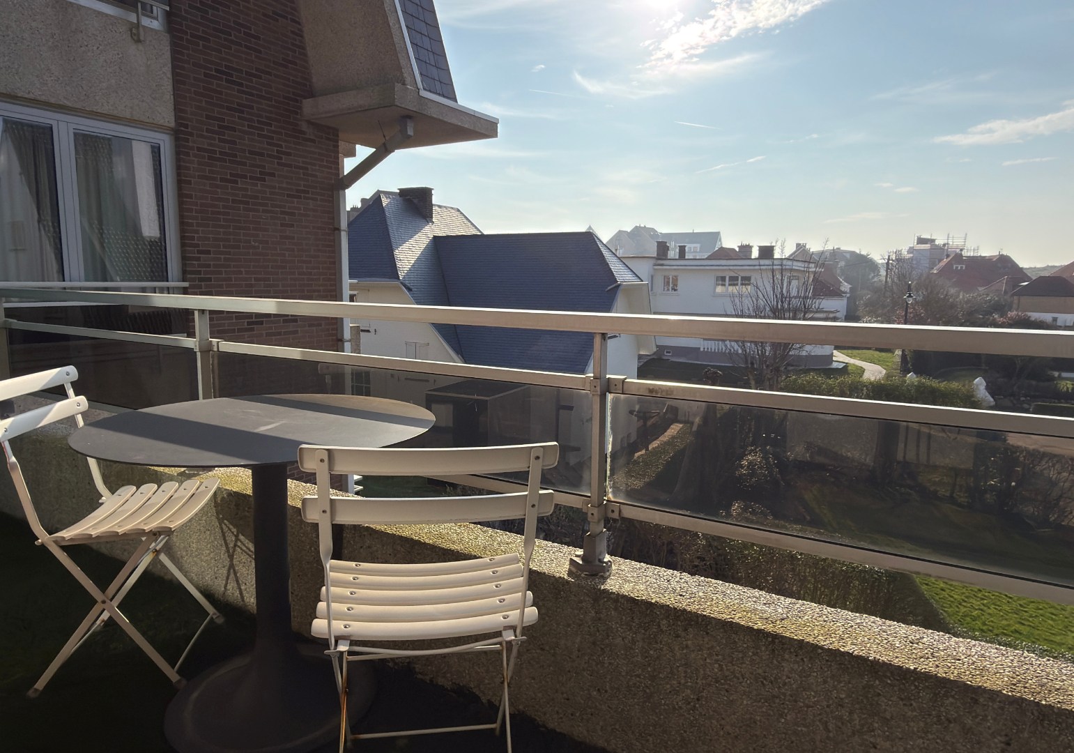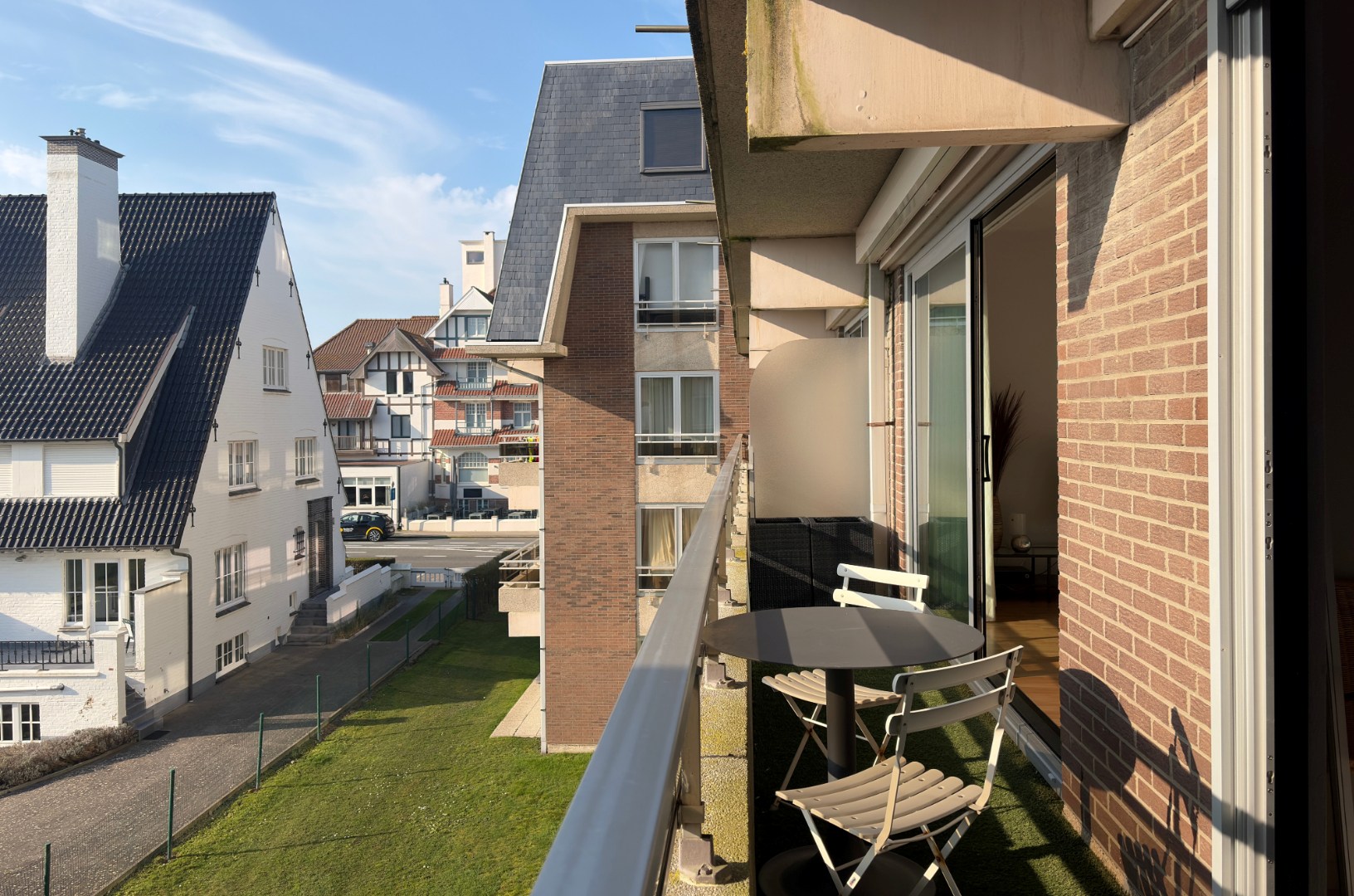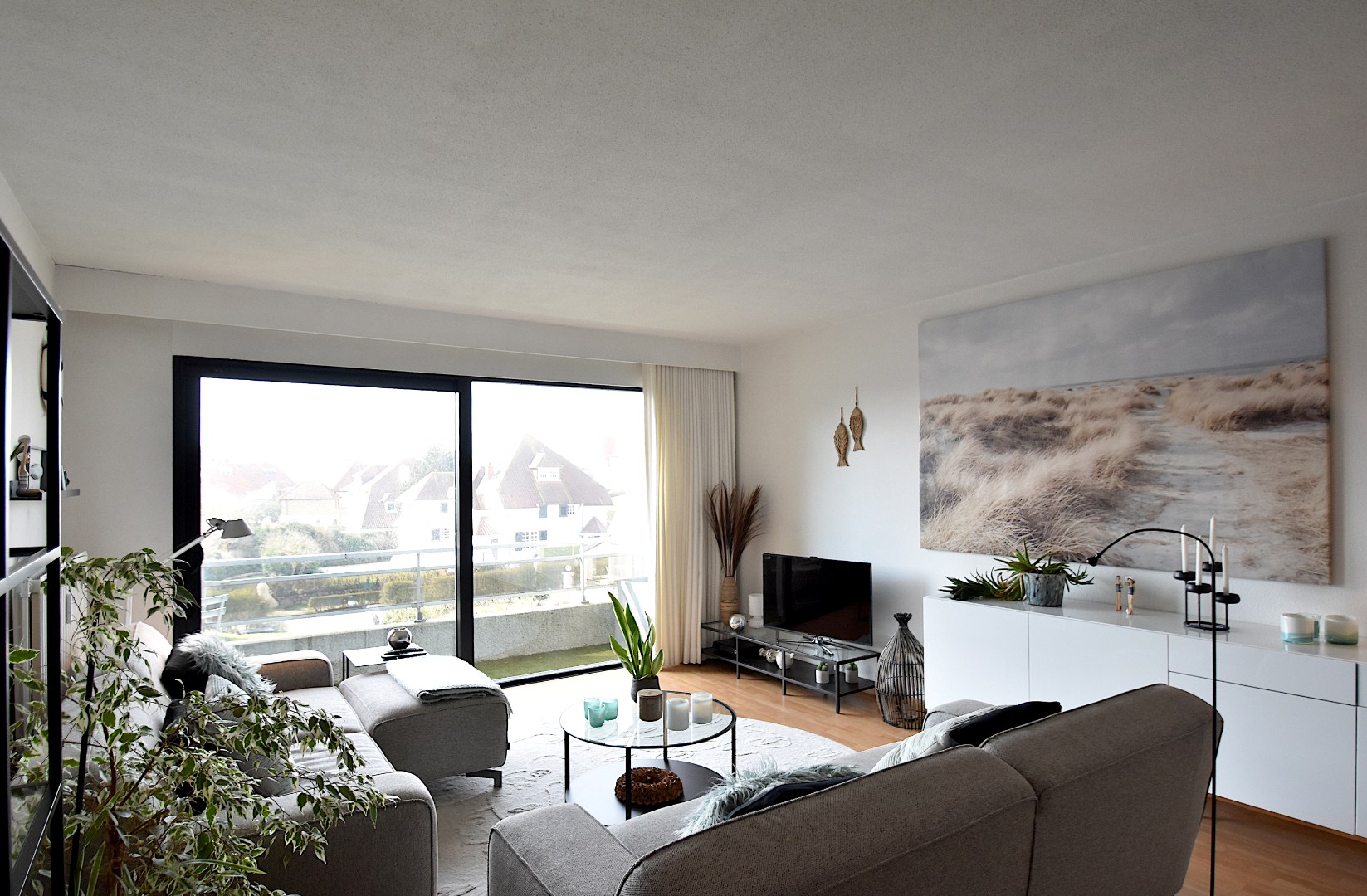Op de tweede verdieping van residentie Lilyta bevindt zich dit zorgvuldig ingedeeld appartement, gelegen aan de zuidzijde van het gebouw. Vanuit het appartement kijkt u uit over de karakteristieke villawijk van De Haan — een weids zicht op witgepleisterde herenwoningen, verzorgde tuinen en de typische rode pannendaken die dit deel van de kust zijn onverwisselbaar karakter geven.