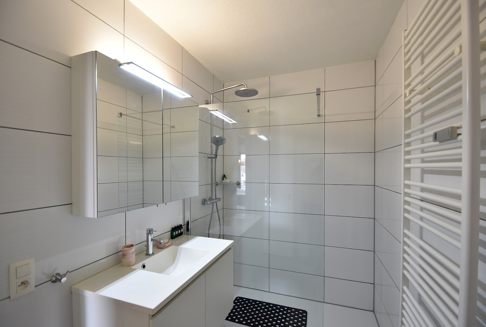 De indeling omvat een inkomhal met bergruimte, ruime leefruimte met eethoek en open keuken, nachthal met twee slaapkamers, moderne badkamer met inloopdouche en een afzonderlijk toilet. Een parkeerplaats in de ondergrondse garage is inbegrepen.