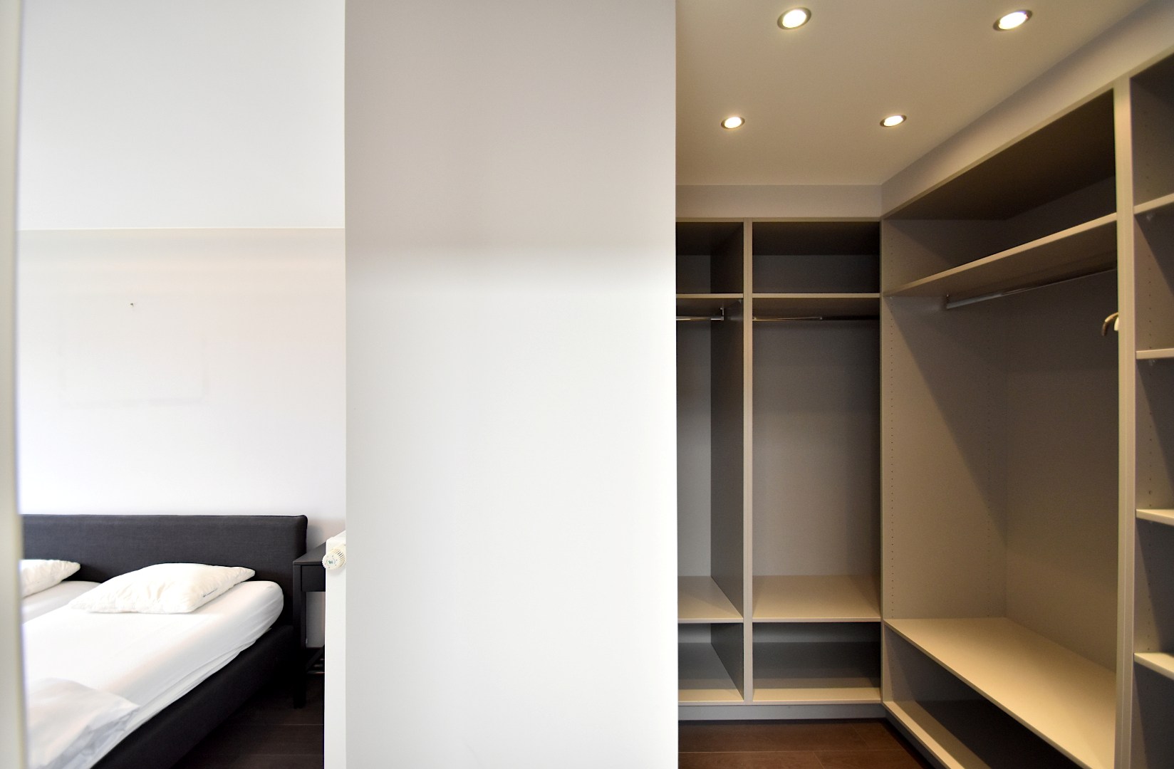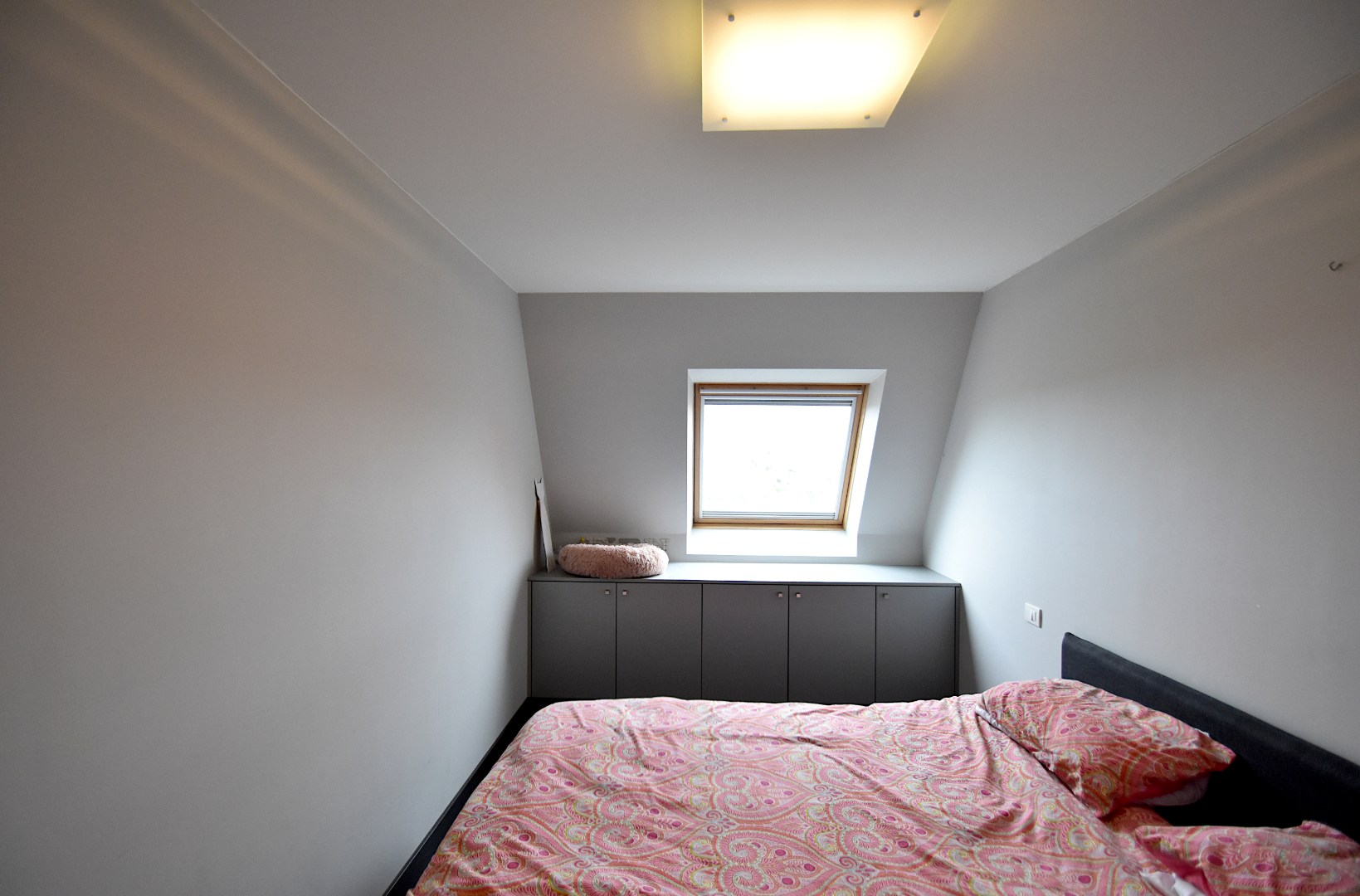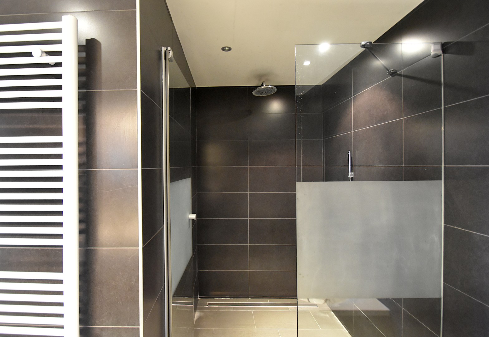 De bovenverdieping omvat drie slaapkamers. De masterkamer heeft een aansluitende, afzonderlijke dressing. Alle slaapkamers zijn voorzien van ingebouwde kasten. De badkamer combineert een ligbad en een ruime inloopdouche met glazen wanden — afgewerkt in donkere leisteen — en een dubbele lavabo. Een afzonderlijk toilet completeert dit verdiep.