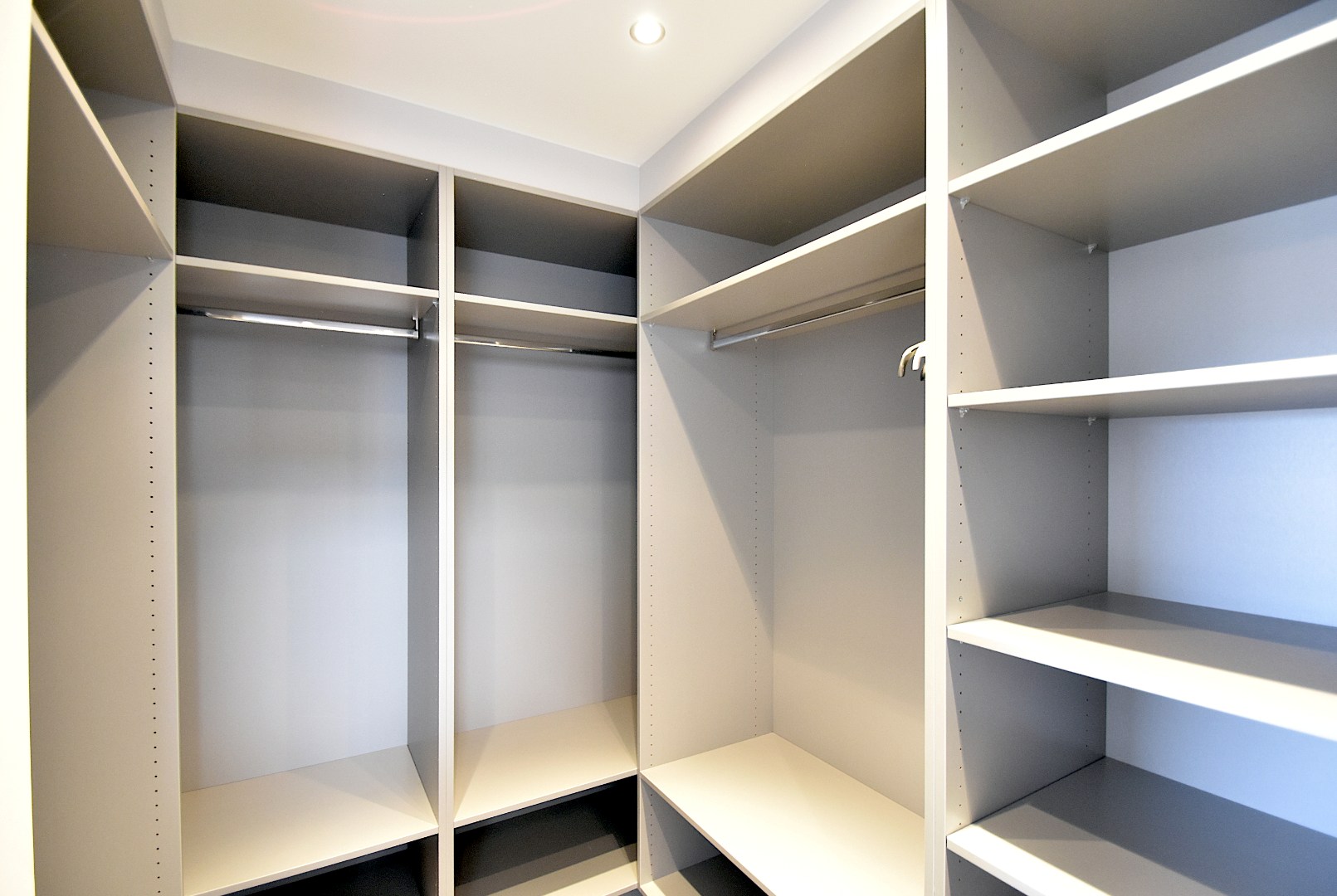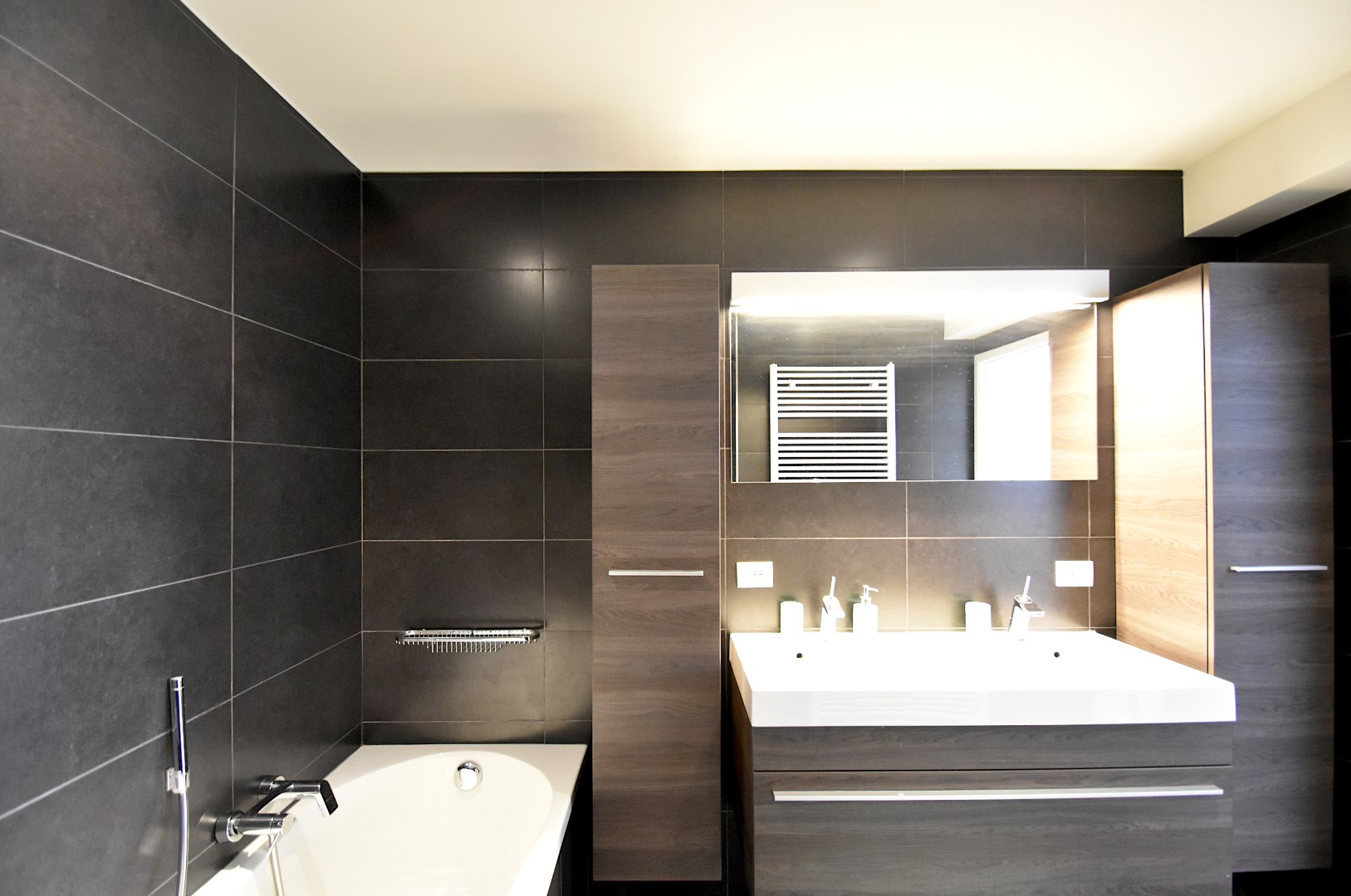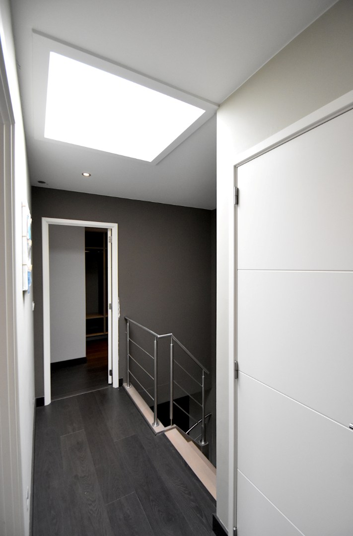 De bovenverdieping omvat drie slaapkamers. De masterkamer heeft een aansluitende, afzonderlijke dressing. Alle slaapkamers zijn voorzien van ingebouwde kasten. De badkamer combineert een ligbad en een ruime inloopdouche met glazen wanden — afgewerkt in donkere leisteen — en een dubbele lavabo. Een afzonderlijk toilet completeert dit verdiep.