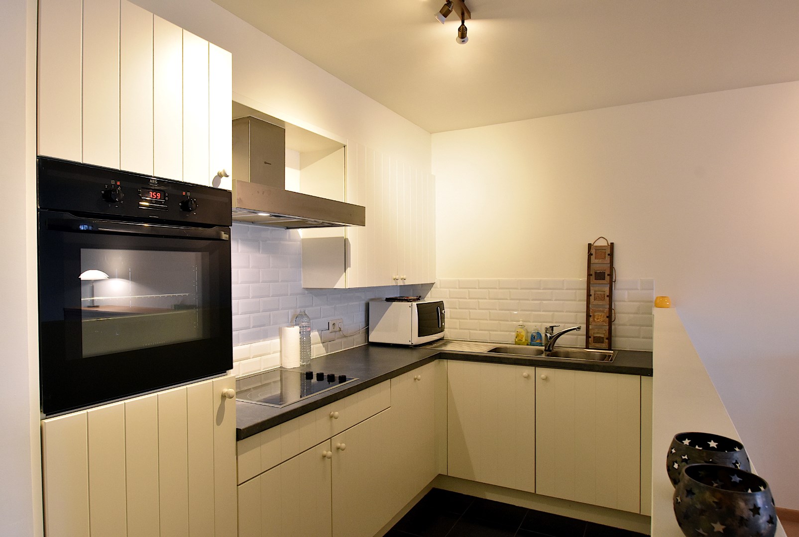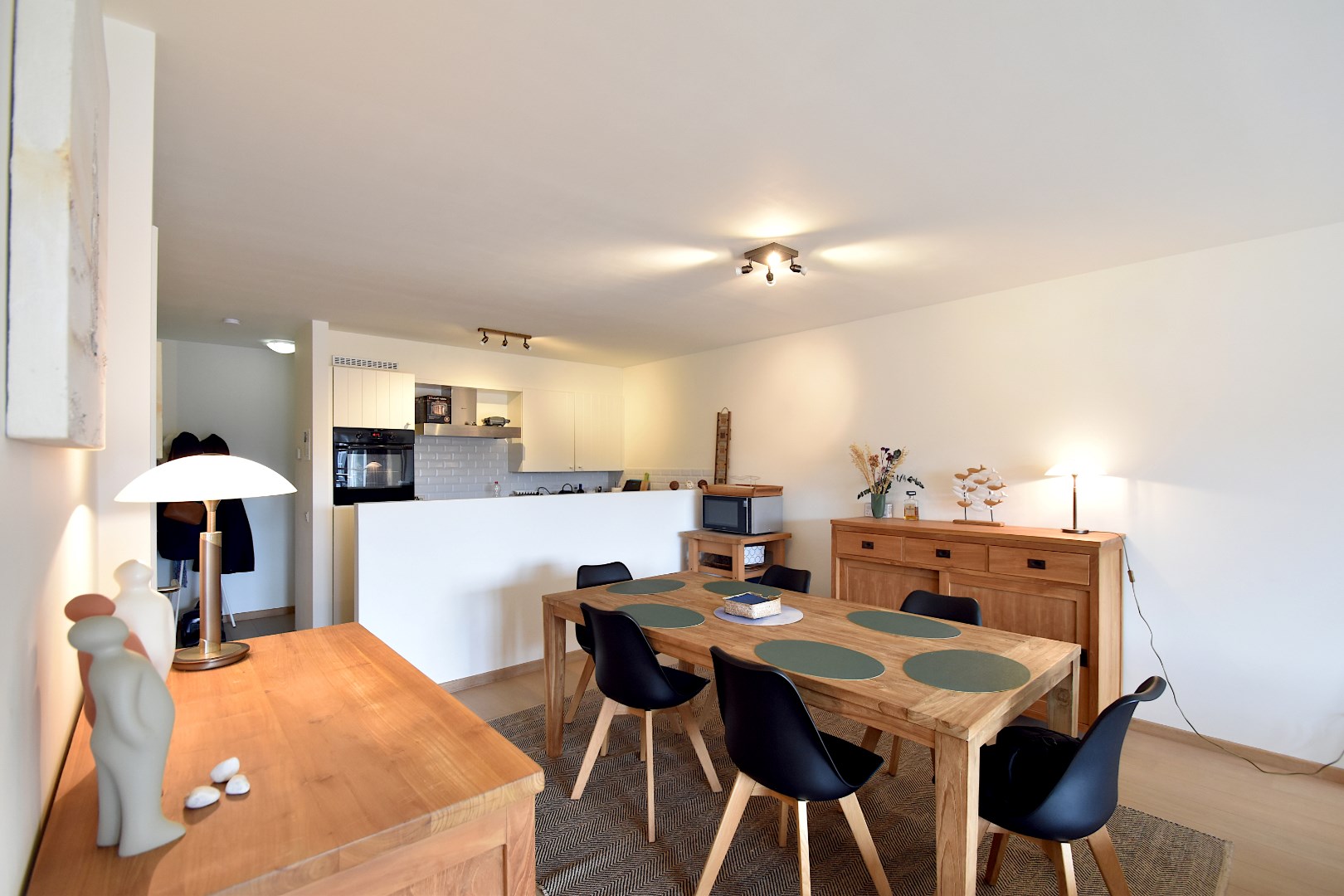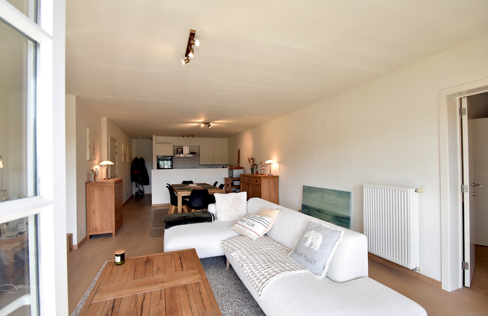 Het appartement beschikt over een ruime leefruimte met brede raampartijen en dubbele openslaande deuren naar het terras. De zithoek sluit naadloos aan op de volledig ingerichte open keuken en een gezellige eethoek.