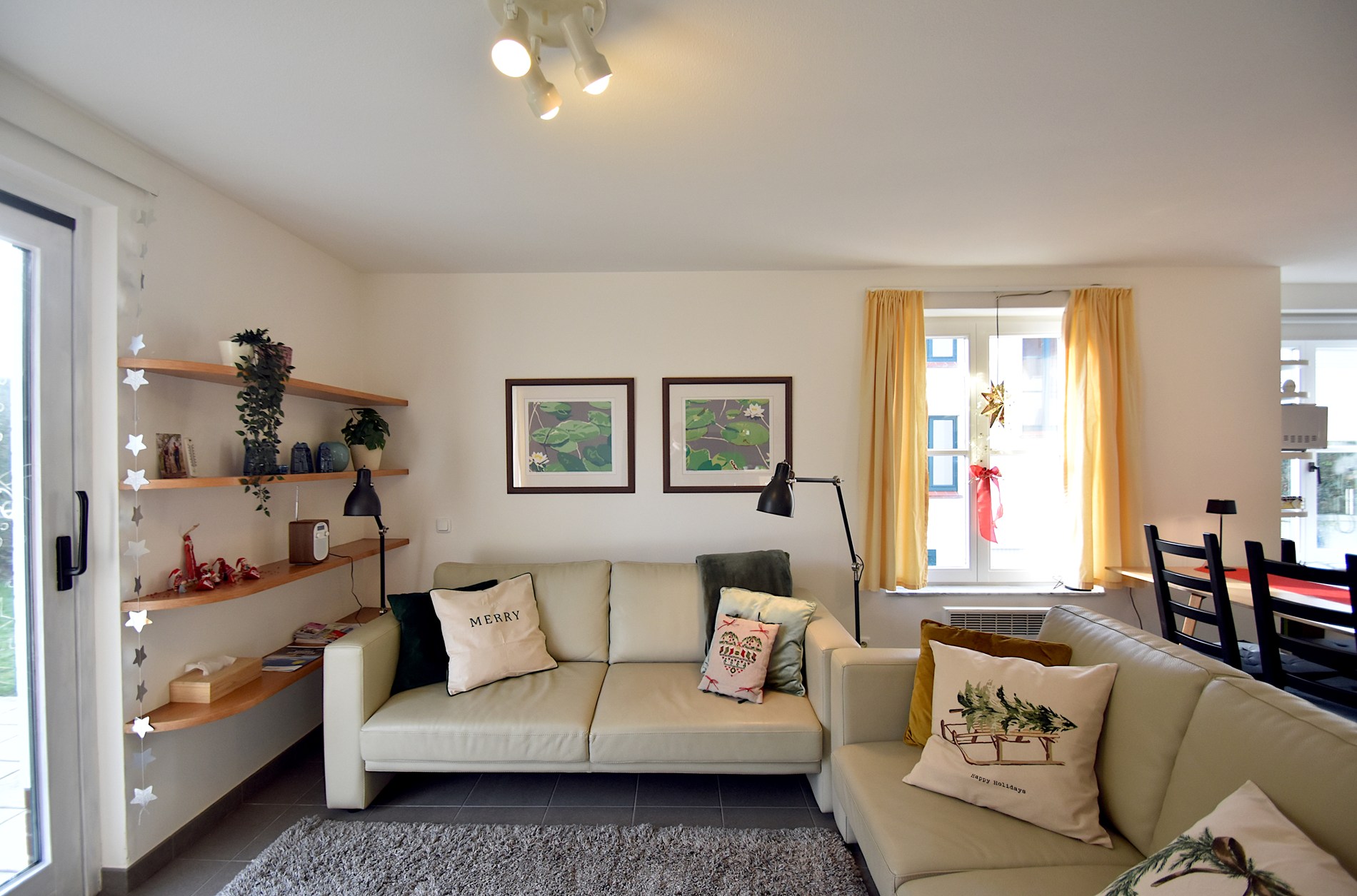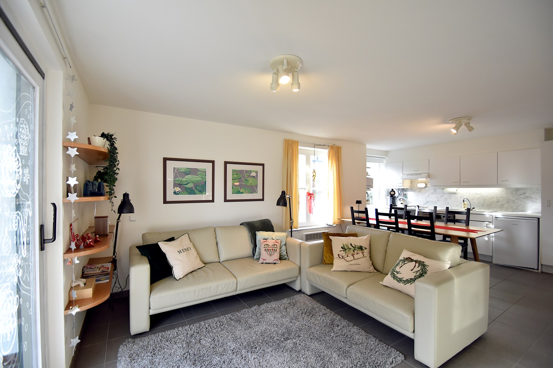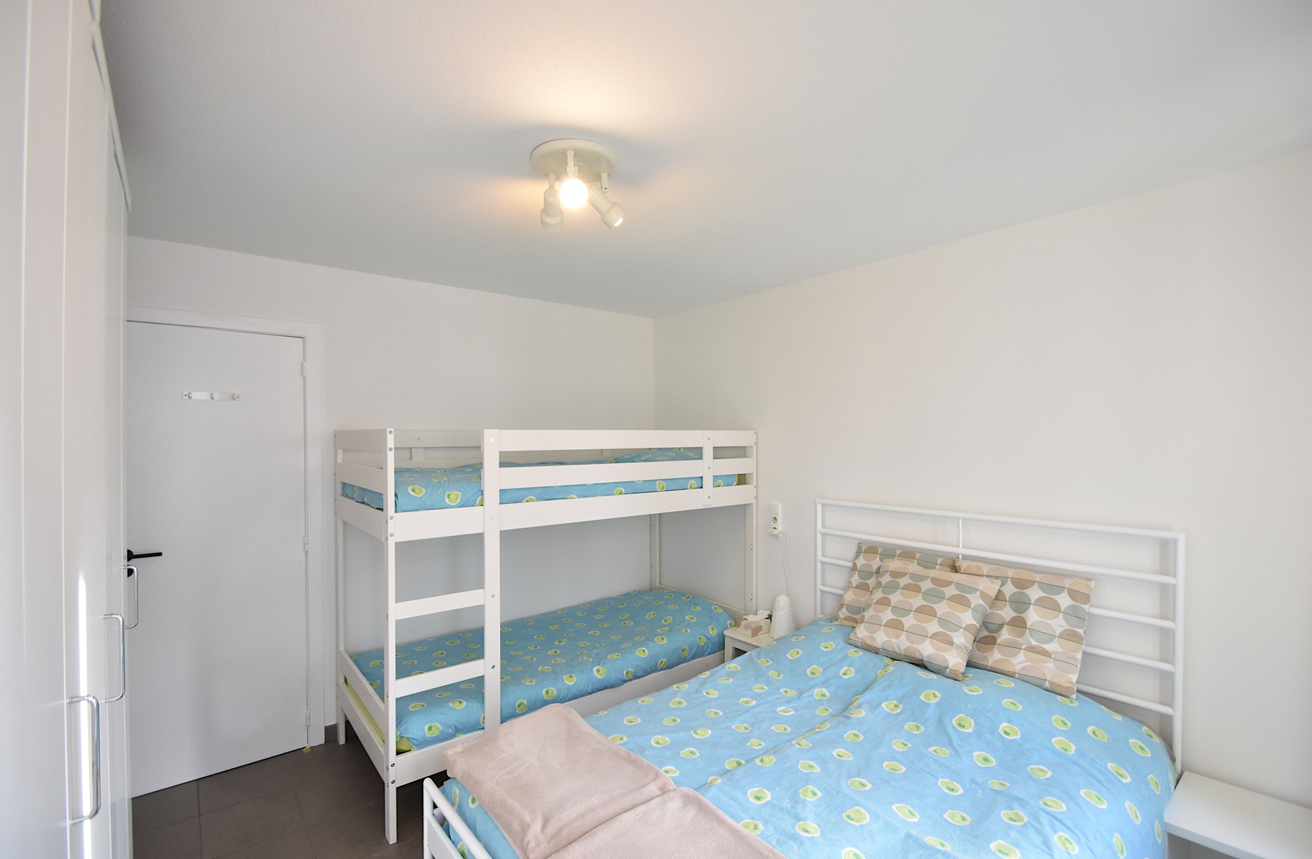 Binnen treft u een lichtrijke leefruimte met een comfortabele zithoek en een open keuken, volledig uitgerust voor een zorgeloze vakantie. Het appartement beschikt over twee slaapkamers: één slaapkamer met een ruim tweepersoonsbed en praktische opbergkasten, en een tweede slaapkamer met een tweepersoonsbed en een stapelbed, ideaal voor gezinnen.